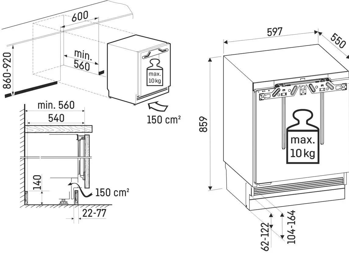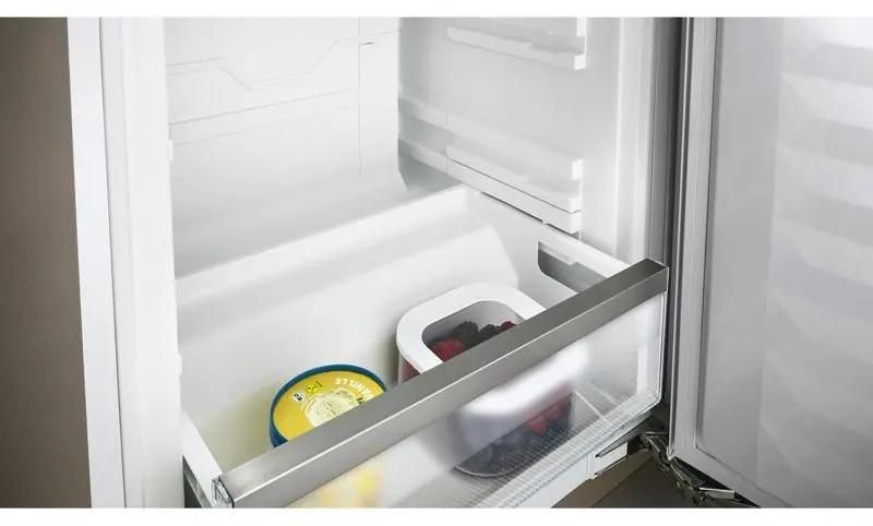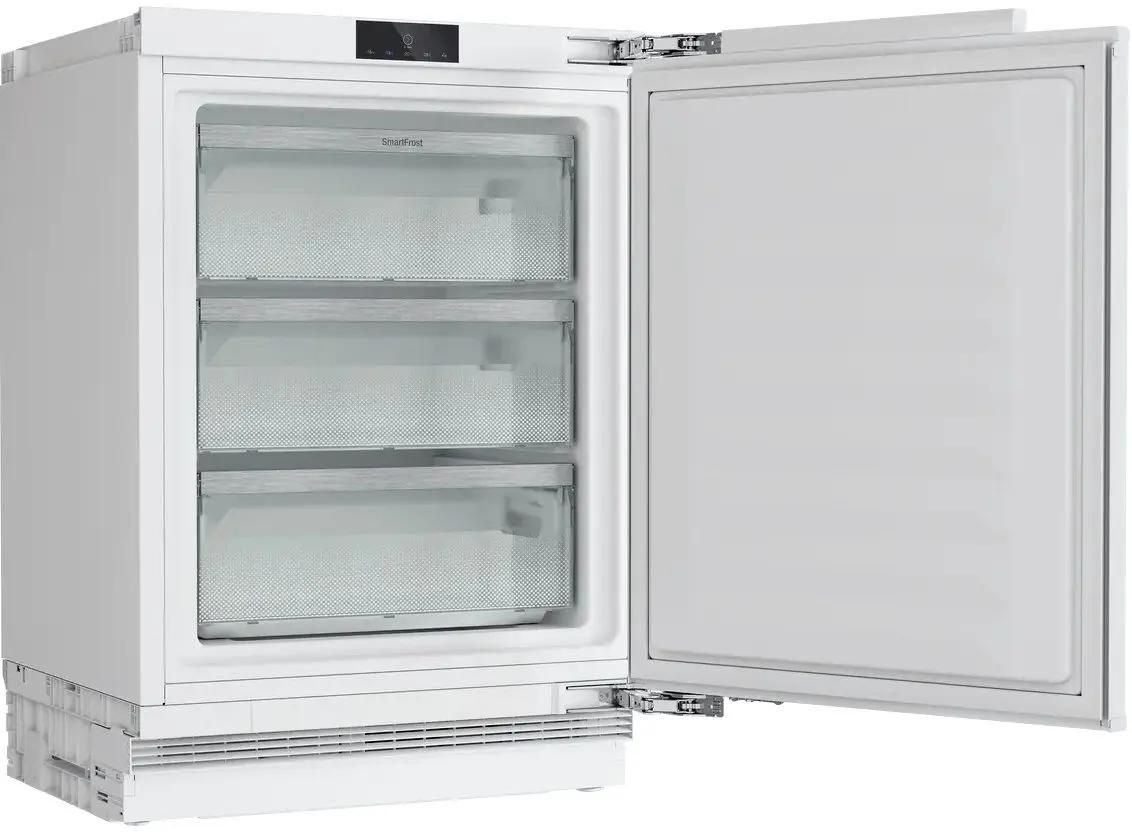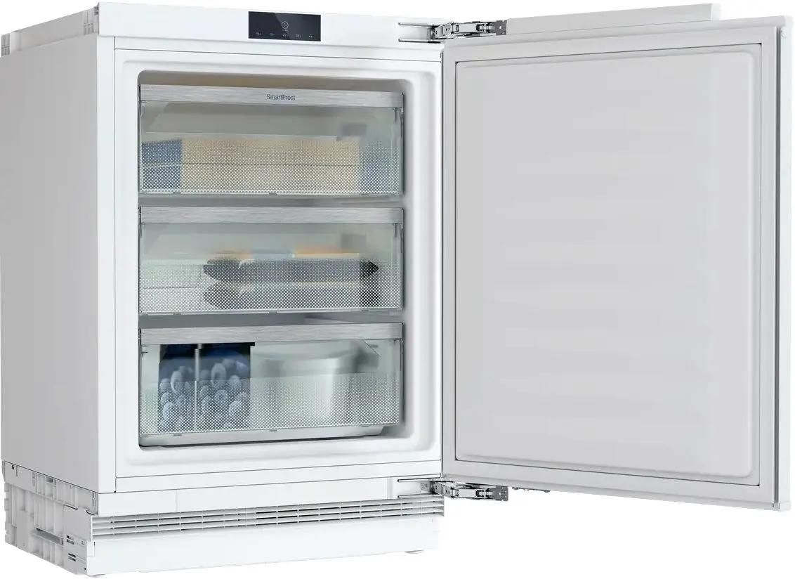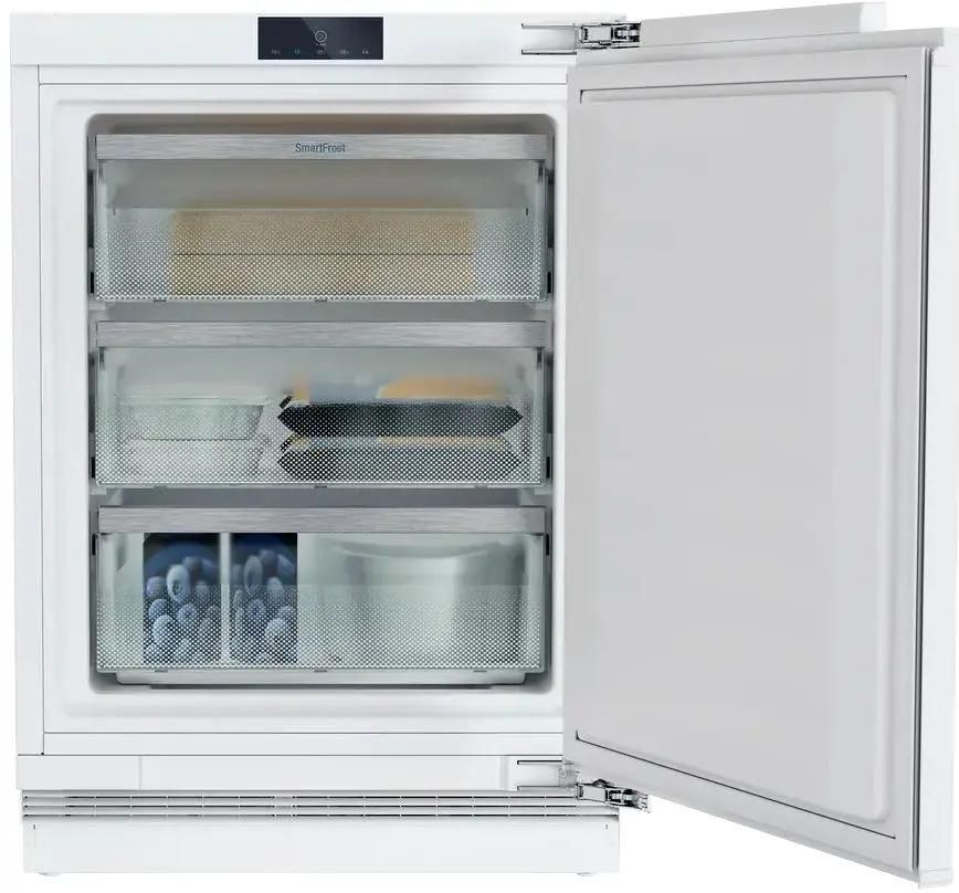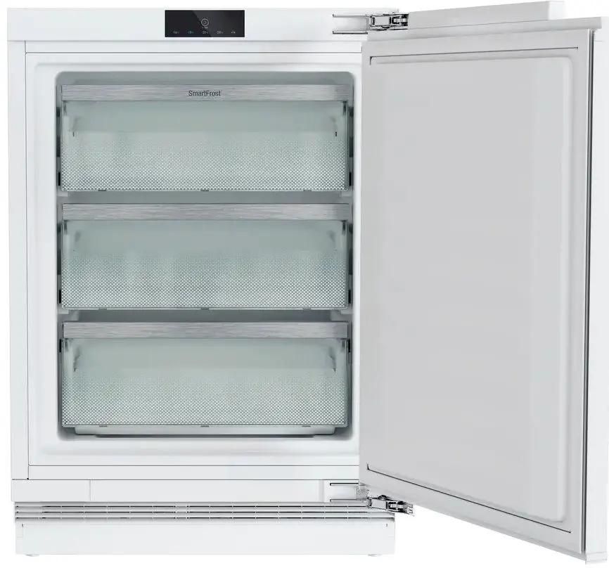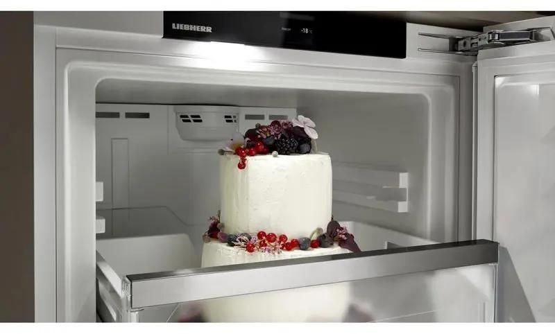 Описание Встраиваемая морозильная камера Liebherr SUFc 3703-20 001 Морозильная камера Liebherr SUFc 3703-20 001 Pure – модель встраиваемого типа, может быть установлена под столешницу. Для монтажа требуется ниша размерами 86-92 х 60 х 56,0 см. Максимально возможный вес фасадной двери – 10 кг, угол открывания – 115°. Общий объем прибора составляет 94 л, мощность замораживание составляет 7,2 кг в сутки. Технология SmartFrost позволяет реже размораживать устройство. Внутреннее оснащение представлено тремя ящиками, которые легко выдвигаются на направляющих. Боксы выполнены по системе VarioSpace – при необходимости их можно извлечь, чтобы адаптировать пространство под текущие нужды, например, чтобы найти место для «крупногабаритных» продуктов. В комплекте – формочки для льда. Сигналы оповещения. В случае, если дверь слишком долго останется открытой, прозвучит предупреждающий сигнал. Это же произойдет при непредусмотренном повышении внутренней температуры. Климатический класс SN-T означает, что морозильная камера будет эффективно выполнять свою задачу практически в любом климате. Сенсорное управление. Панель управления размещена за дверью, в верхней части корпуса. Отличается простотой и удобством, интуитивно понятна. Температуру можно задать в диапазоне от -15°С до -28°С. Поддерживается режим «Суперзамораживание», который будет полезен при крупной загрузке продуктов и поможет быстро подготовить их к дальнейшему хранению. Экономичное потребление электроэнергии и тихая работа. В год прибор расходует всего 113 кВт*ч. Используется современный компрессор, уровень шума не превышает 34 дБ. Система охлаждения заправлена хладагентом R600A, который не оказывает негативного влияния на окружающую среду и озоновый слой. При перебое в подаче питания низкая внутренняя температура будет сохраняться в течение 17,5 часа. Прочие особенности. Вентиляционные отверстия расположены впереди снизу, что дает возможность установить морозильную камеру близко к стене. Уплотнитель легко снимается – при необходимости его можно легко заменить.