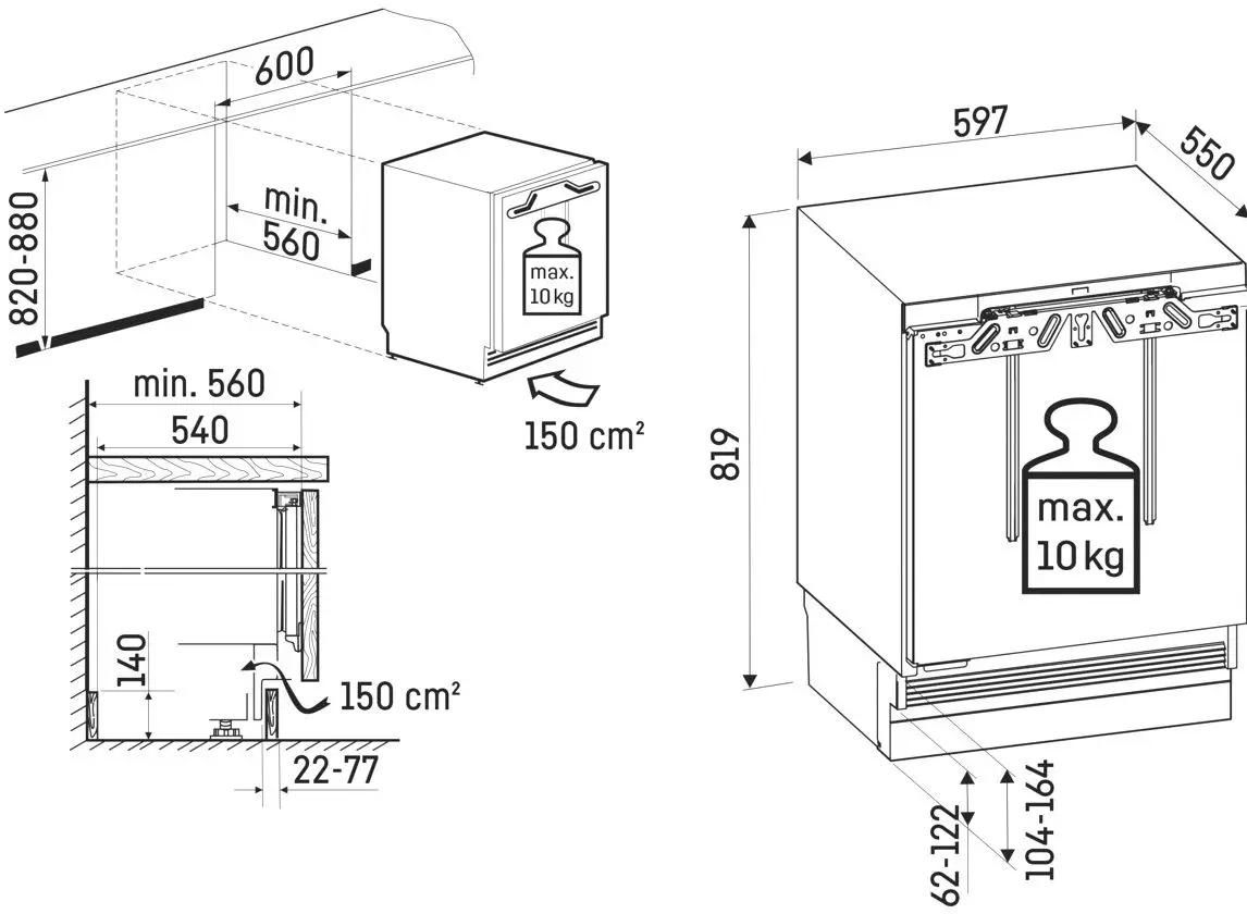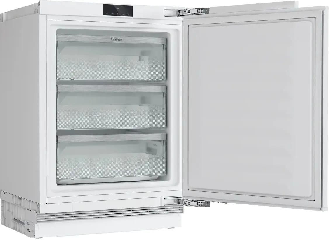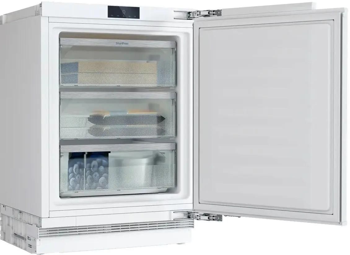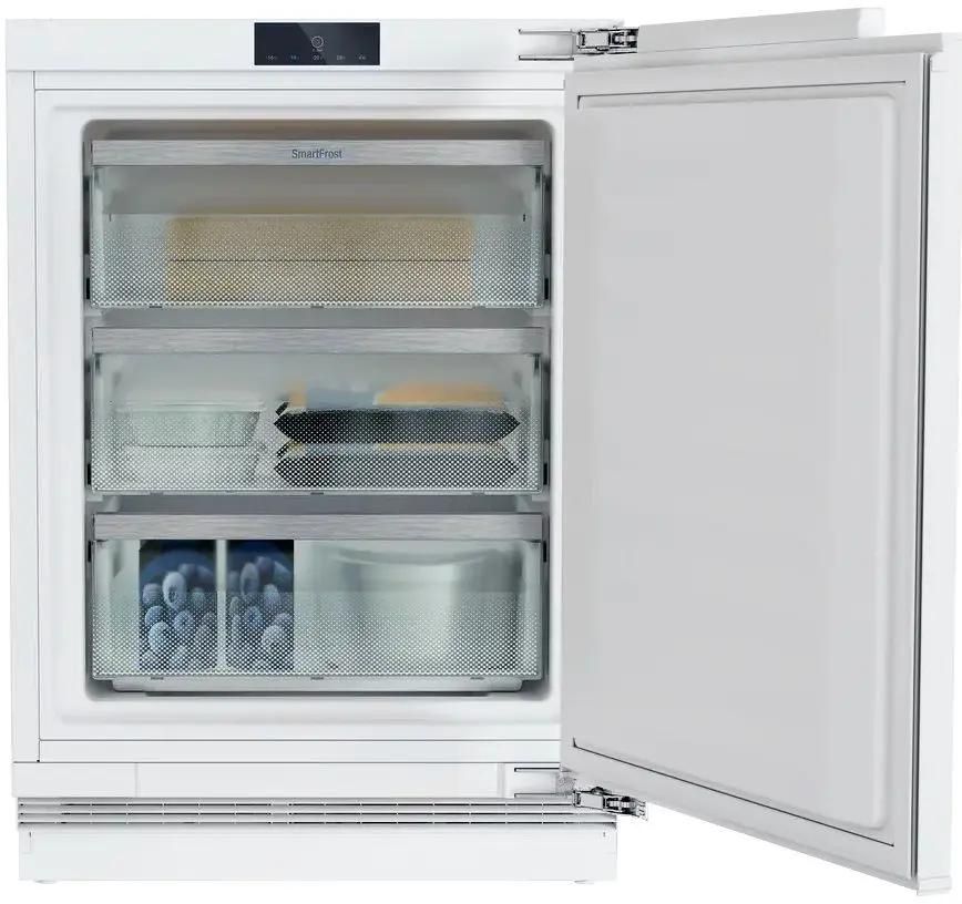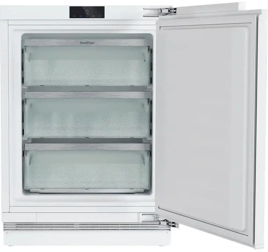Описание Встраиваемая морозильная камера Liebherr SUFd 3603-20 001 Морозильная камера Liebherr SUFc 3703-20 001 Pure – модель встраиваемого типа, может быть установлена под столешницу. Для монтажа требуется ниша размерами 86-92 х 60 х 56,0 см. Максимально возможный вес фасадной двери – 10 кг, угол открывания – 115°. Общий объем прибора составляет 94 л, мощность замораживание составляет 7,2 кг в сутки. Технология SmartFrost позволяет реже размораживать устройство. Внутреннее оснащение представлено тремя ящиками, которые легко выдвигаются на направляющих. Боксы выполнены по системе VarioSpace – при необходимости их можно извлечь, чтобы адаптировать пространство под текущие нужды, например, чтобы найти место для «крупногабаритных» продуктов. В комплекте – формочки для льда. Сигналы оповещения. В случае, если дверь слишком долго останется открытой, прозвучит предупреждающий сигнал. Это же произойдет при непредусмотренном повышении внутренней температуры. Климатический класс SN-T означает, что морозильная камера будет эффективно выполнять свою задачу практически в любом климате. Сенсорное управление. Панель управления размещена за дверью, в верхней части корпуса. Отличается простотой и удобством, интуитивно понятна. Температуру можно задать в диапазоне от -15°С до -28°С. Поддерживается режим «Суперзамораживание», который будет полезен при крупной загрузке продуктов и поможет быстро подготовить их к дальнейшему хранению. Экономичное потребление электроэнергии и тихая работа. В год прибор расходует всего 113 кВт*ч. Используется современный компрессор, уровень шума не превышает 34 дБ. Система охлаждения заправлена хладагентом R600A, который не оказывает негативного влияния на окружающую среду и озоновый слой. При перебое в подаче питания низкая внутренняя температура будет сохраняться в течение 17,5 часа. Прочие особенности. Вентиляционные отверстия расположены впереди снизу, что дает возможность установить морозильную камеру близко к стене. Уплотнитель легко снимается – при необходимости его можно легко заменить.